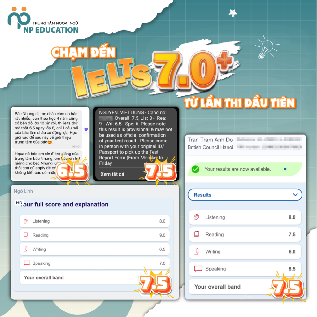 NP Education đã chứng kiến sự tiến bộ đáng kể của từng học viên, từ việc vượt qua những thách thức đầu tiên đến việc tự tin đối diện với kỳ thi quốc tế. Các bạn không chỉ là học sinh mà còn là những chiến binh IELTS, sẵn sàng đối mặt với thách thức và đạt được thành công.