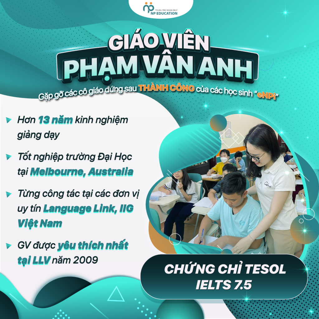 Gắn bó với NP từ năm 2020, cô Vân Anh được Trung tâm và học sinh vô cùng yêu mến và đánh giá cao về chuyên môn lẫn phong cách giảng dạy. Đồng hành và dìu dắt các học sinh lớp Ngữ pháp ở cả 3 trình độ, hơn ai hết cô Vân Anh hiểu được những khó khăn, rào cản và cả nỗ lực, phấn đấu của các em.