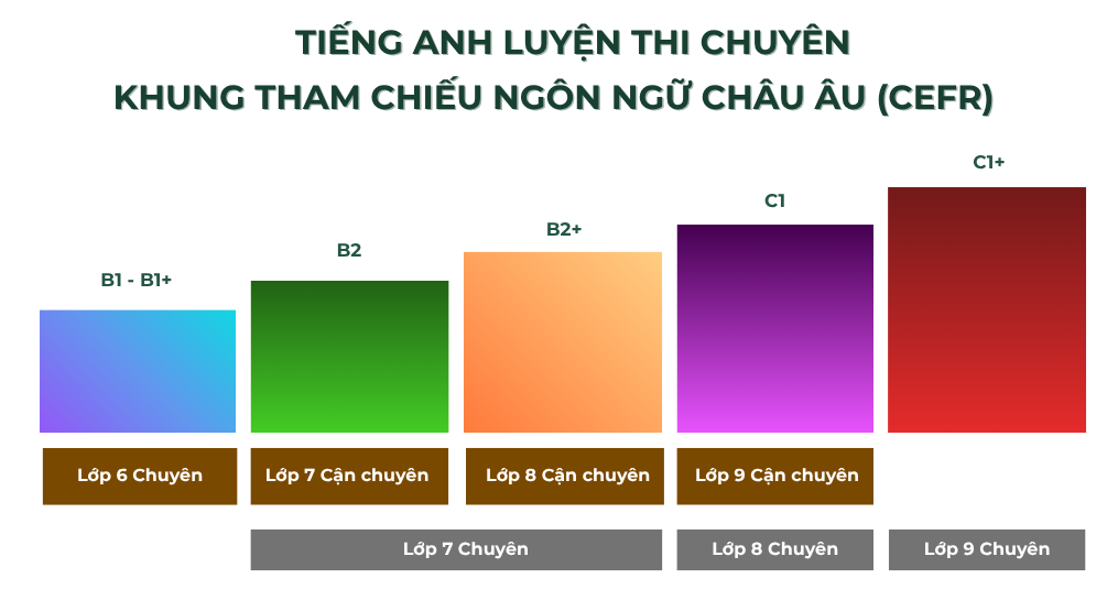 – Chương trình được thiết kế nhằm cung cấp kiến thức ngữ pháp, tăng cường vốn từ vựng và phát triển các kỹ năng cần thiết khác (đọc, nghe, luyện đề) để phục vụ mục đích luyện thi vào 10 trường Công lập và trường Chuyên.